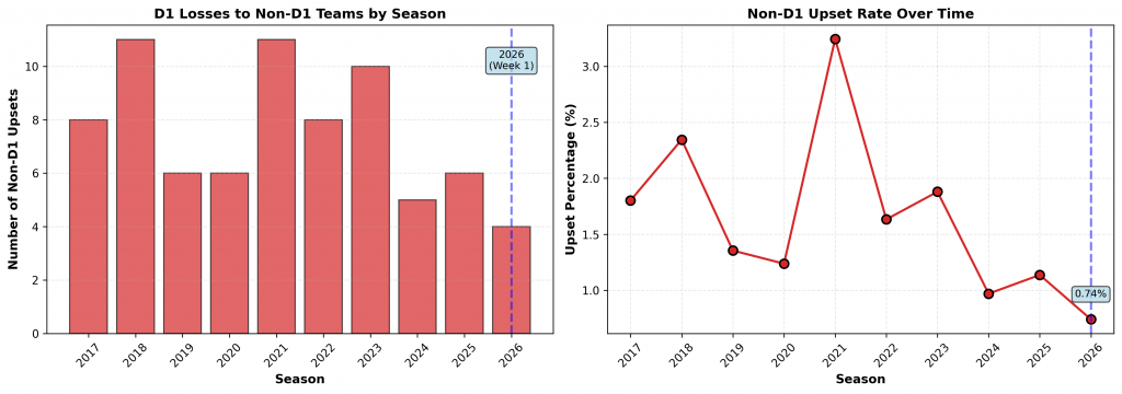 Figure 2: Left panel shows annual counts of D1 losses to non-D1 teams. Right panel displays the upset percentage over time. The 2026 season already has three such upsets from just Week 1.