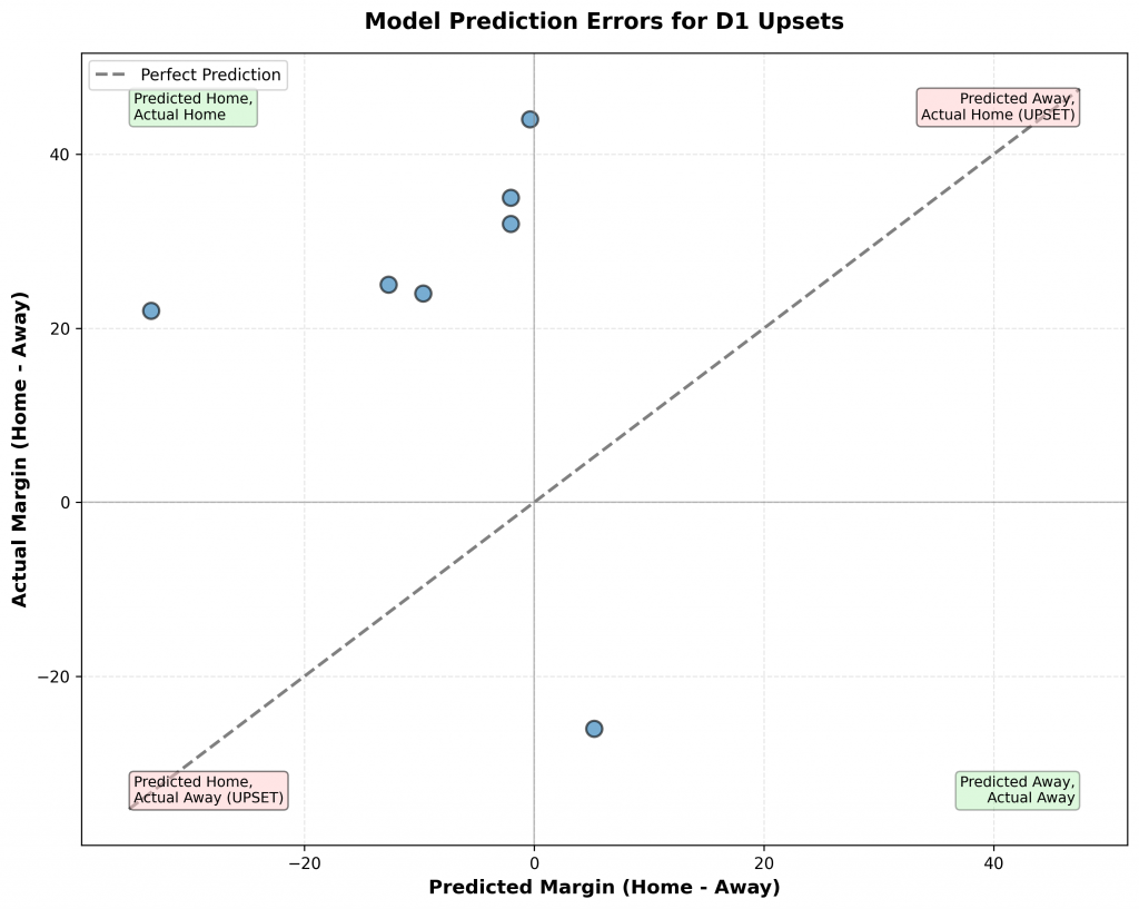 Figure 3: Scatter plot showing predicted margins versus actual margins for D1 upsets. Points in the upper-left and lower-right quadrants represent upsets where the model predicted the wrong winner. The distance from the diagonal line indicates prediction error magnitude.