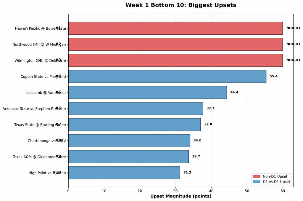 Figure 1: The ten biggest upsets of Week 1, ranked by significance. Red bars indicate non-D1 upsets (D1 teams losing to non-D1 opponents), which rank #1-#3 as the most catastrophic results. Blue bars show D1 versus D1 upsets (#4-#10) ranked by prediction error magnitude.