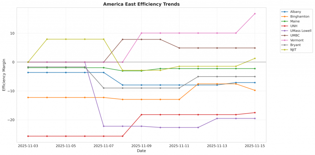 Figure 1: Efficiency margin trends for America East teams throughout the season. Teams trending upward show improving performance, while downward trends indicate struggles.