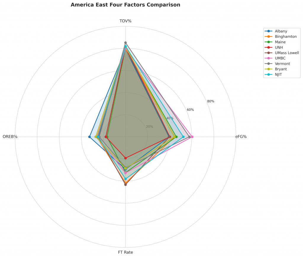 Figure 2: Four Factors comparison across America East teams. The radar chart shows each team’s offensive efficiency (eFG%), ball security (TOV%), rebounding (OREB%), and free throw generation (FT Rate).