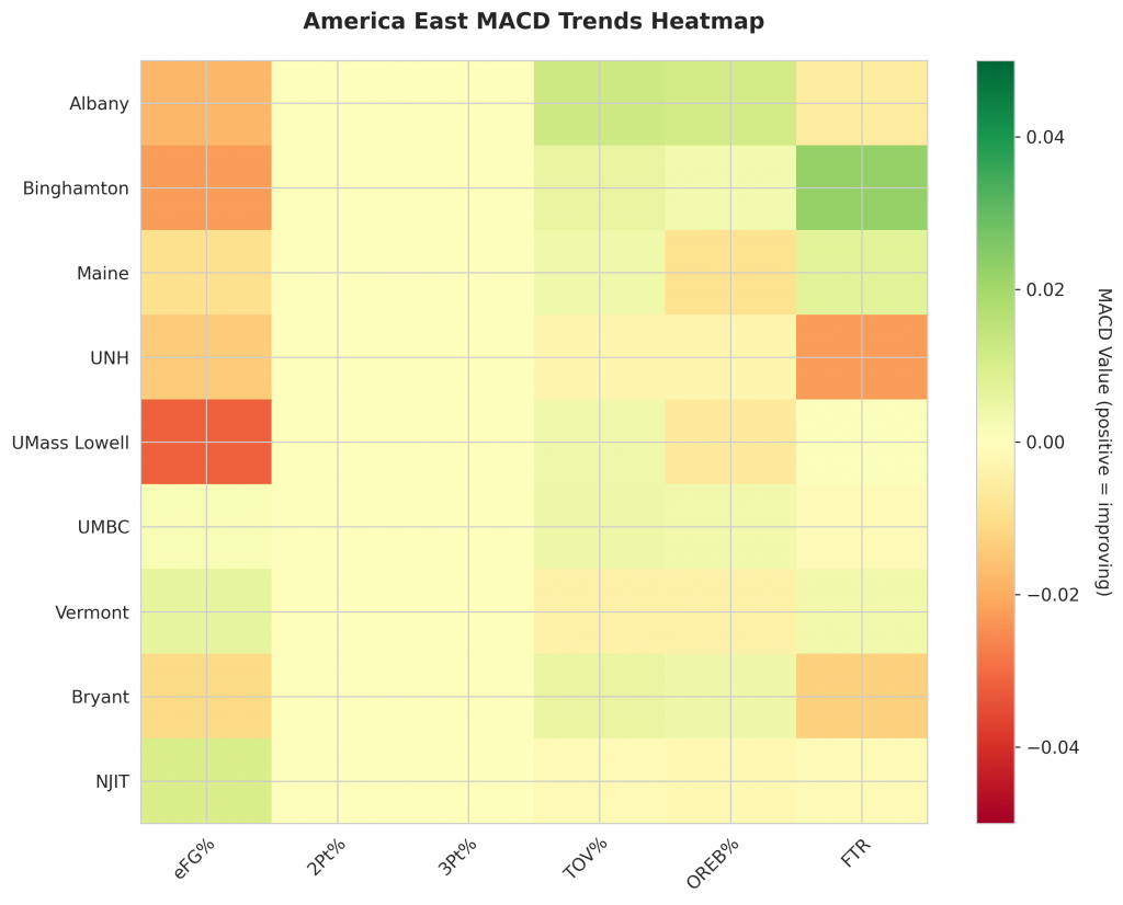 As America East teams continue their season, the MACD trending indicators will help identify which teams are genuinely improving versus those riding unsustainable momentum. Check back next week for updated analysis.