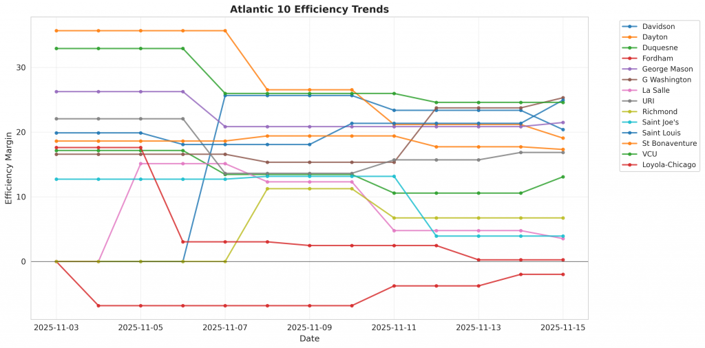 Figure 1: Efficiency margin trends for Atlantic 10 teams throughout the season. Teams trending upward show improving performance, while downward trends indicate struggles.