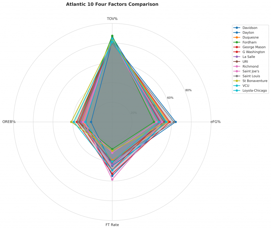 Figure 2: Four Factors comparison across Atlantic 10 teams. The radar chart shows each team’s offensive efficiency (eFG%), ball security (TOV%), rebounding (OREB%), and free throw generation (FT Rate).