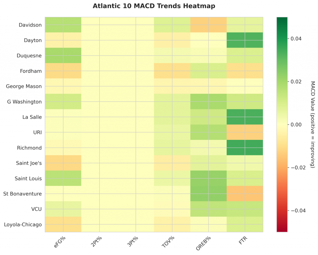 As Atlantic 10 teams continue their season, the MACD trending indicators will help identify which teams are genuinely improving versus those riding unsustainable momentum. Check back next week for updated analysis.