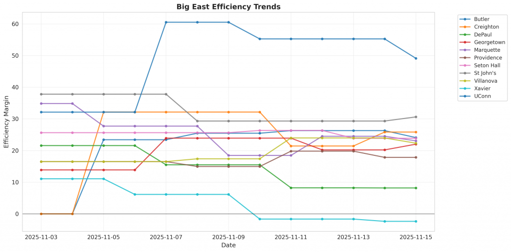 Figure 1: Efficiency margin trends for Big East teams throughout the season. Teams trending upward show improving performance, while downward trends indicate struggles.