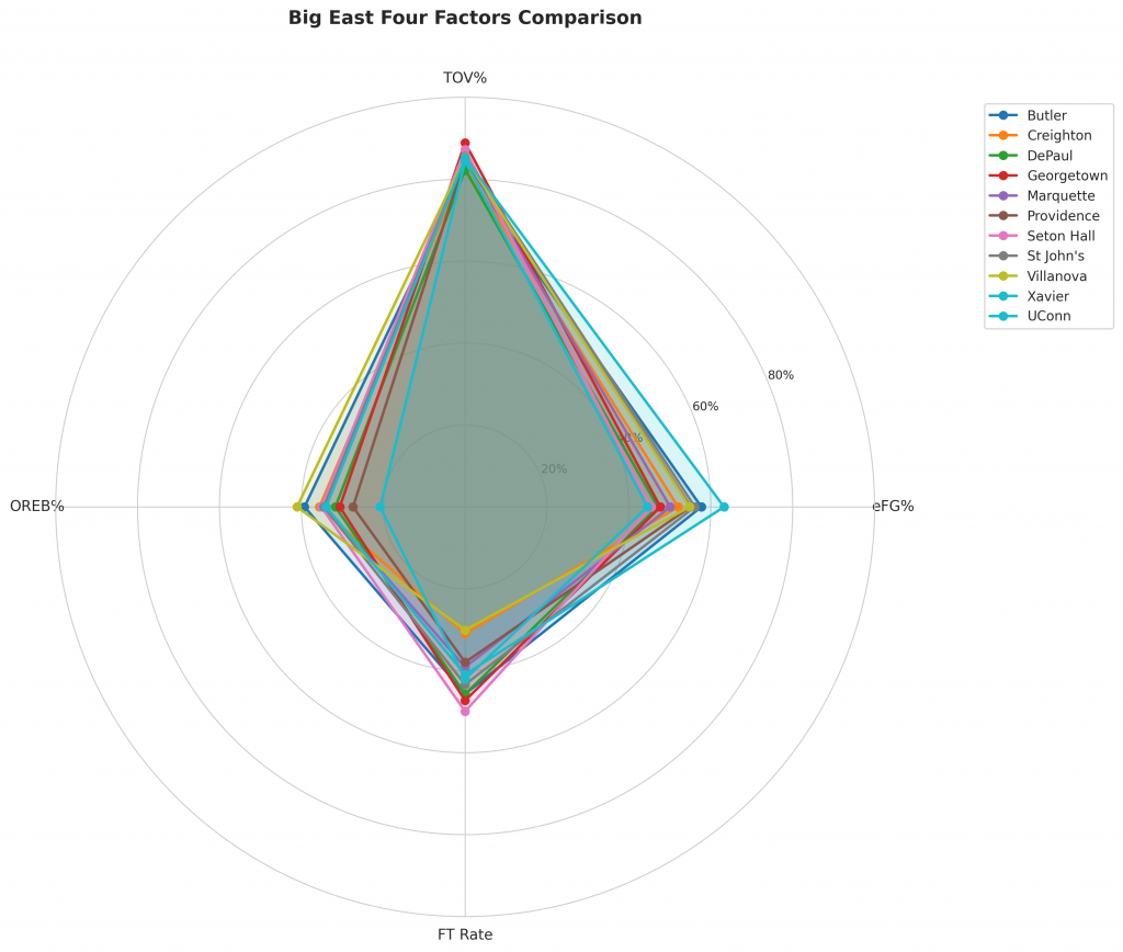 Figure 2: Four Factors comparison across Big East teams. The radar chart shows each team’s offensive efficiency (eFG%), ball security (TOV%), rebounding (OREB%), and free throw generation (FT Rate).