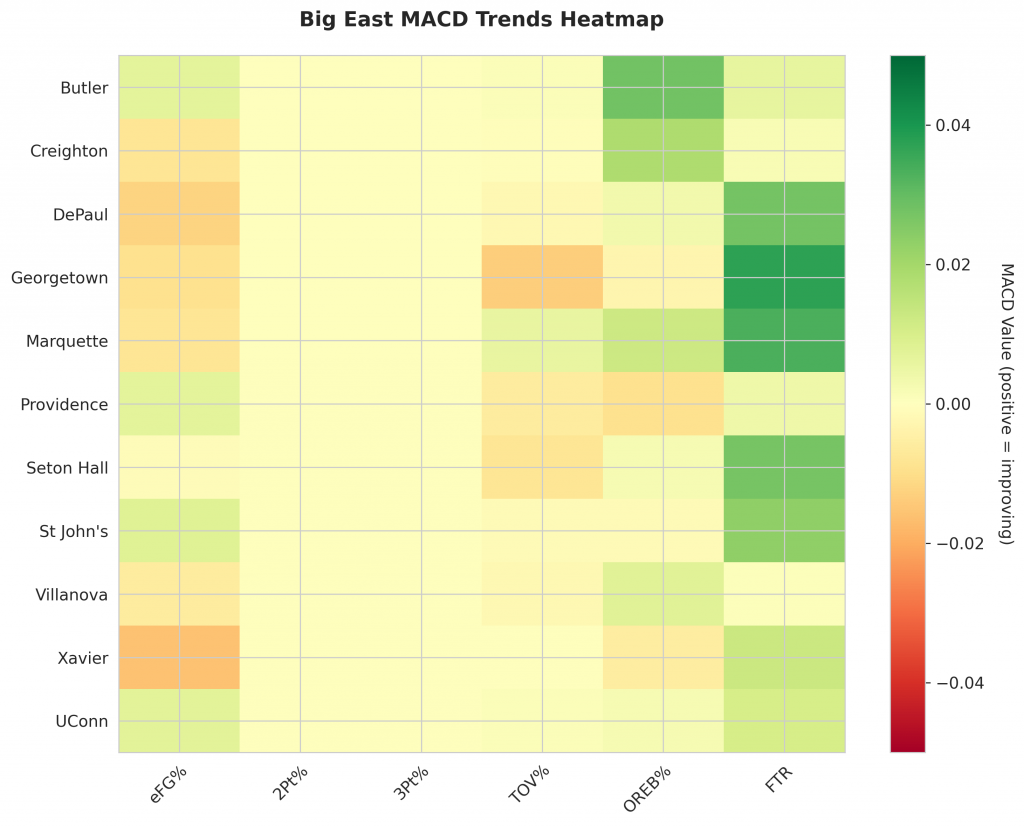 As Big East teams continue their season, the MACD trending indicators will help identify which teams are genuinely improving versus those riding unsustainable momentum. Check back next week for updated analysis.