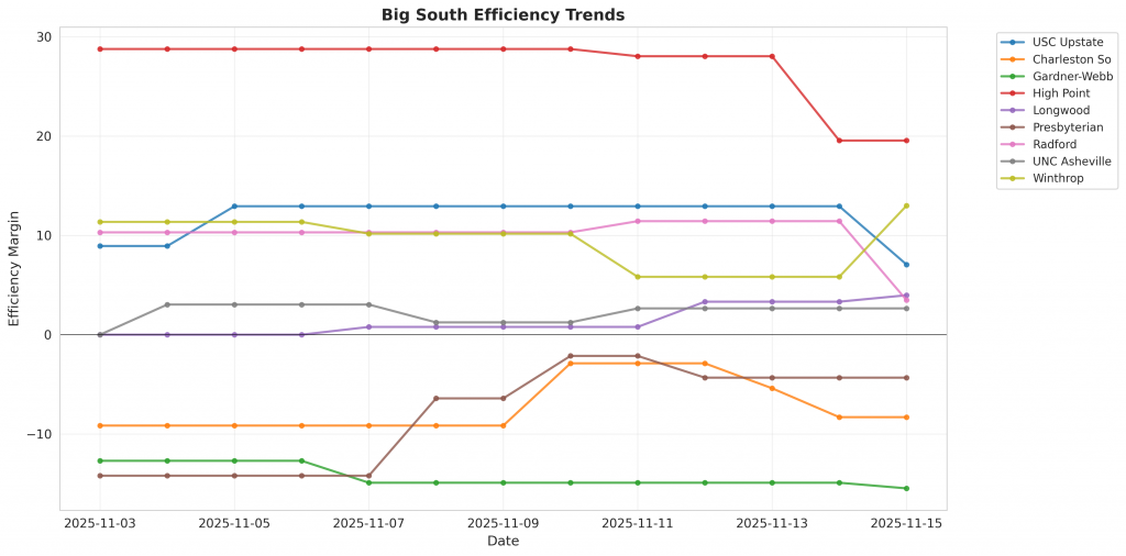 Figure 1: Efficiency margin trends for Big South teams throughout the season. Teams trending upward show improving performance, while downward trends indicate struggles.