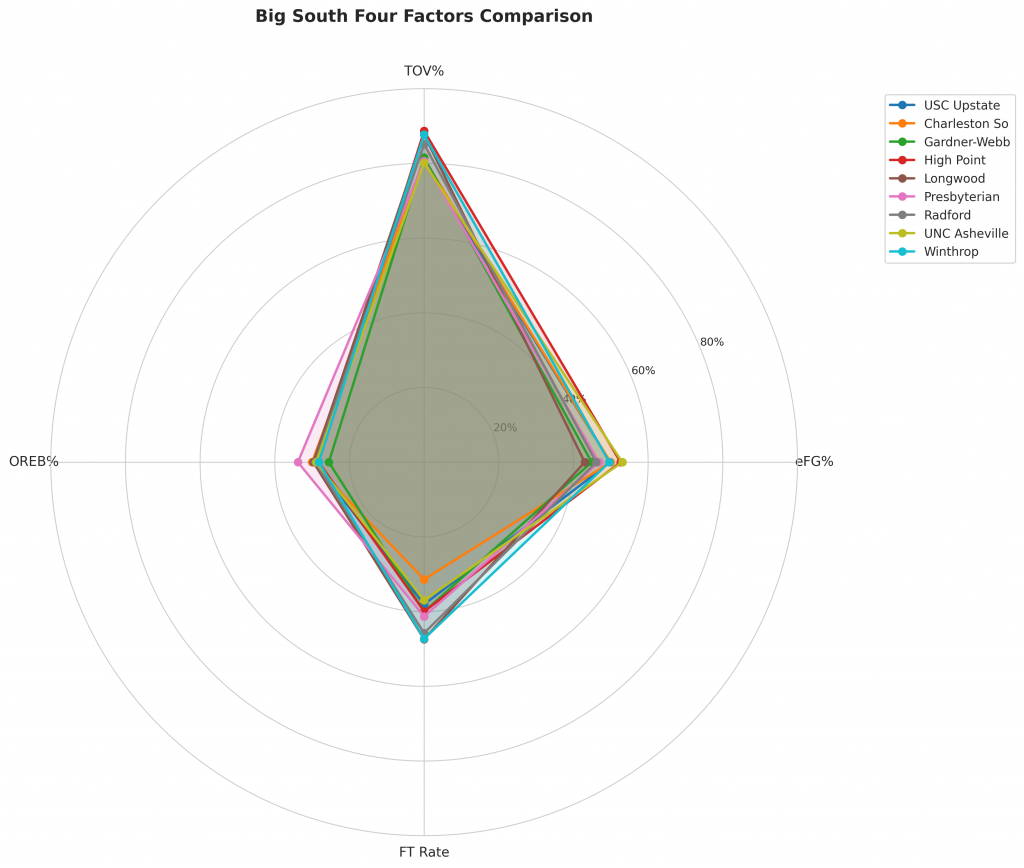 Figure 2: Four Factors comparison across Big South teams. The radar chart shows each team’s offensive efficiency (eFG%), ball security (TOV%), rebounding (OREB%), and free throw generation (FT Rate).