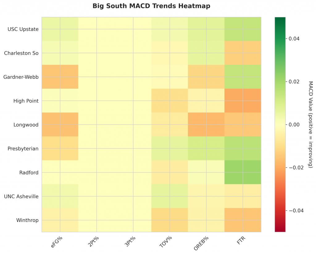 As Big South teams continue their season, the MACD trending indicators will help identify which teams are genuinely improving versus those riding unsustainable momentum. Check back next week for updated analysis.