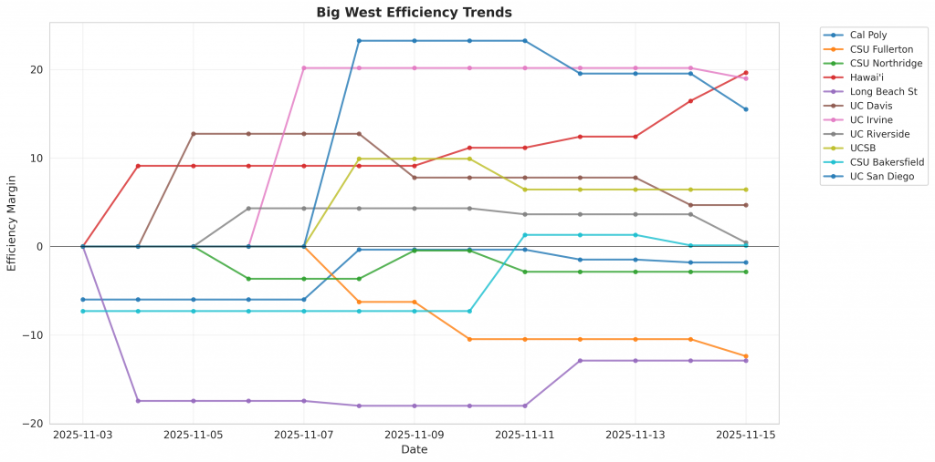 Figure 1: Efficiency margin trends for Big West teams throughout the season. Teams trending upward show improving performance, while downward trends indicate struggles.