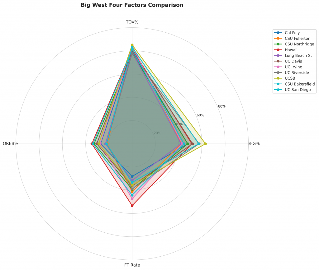 Figure 2: Four Factors comparison across Big West teams. The radar chart shows each team’s offensive efficiency (eFG%), ball security (TOV%), rebounding (OREB%), and free throw generation (FT Rate).