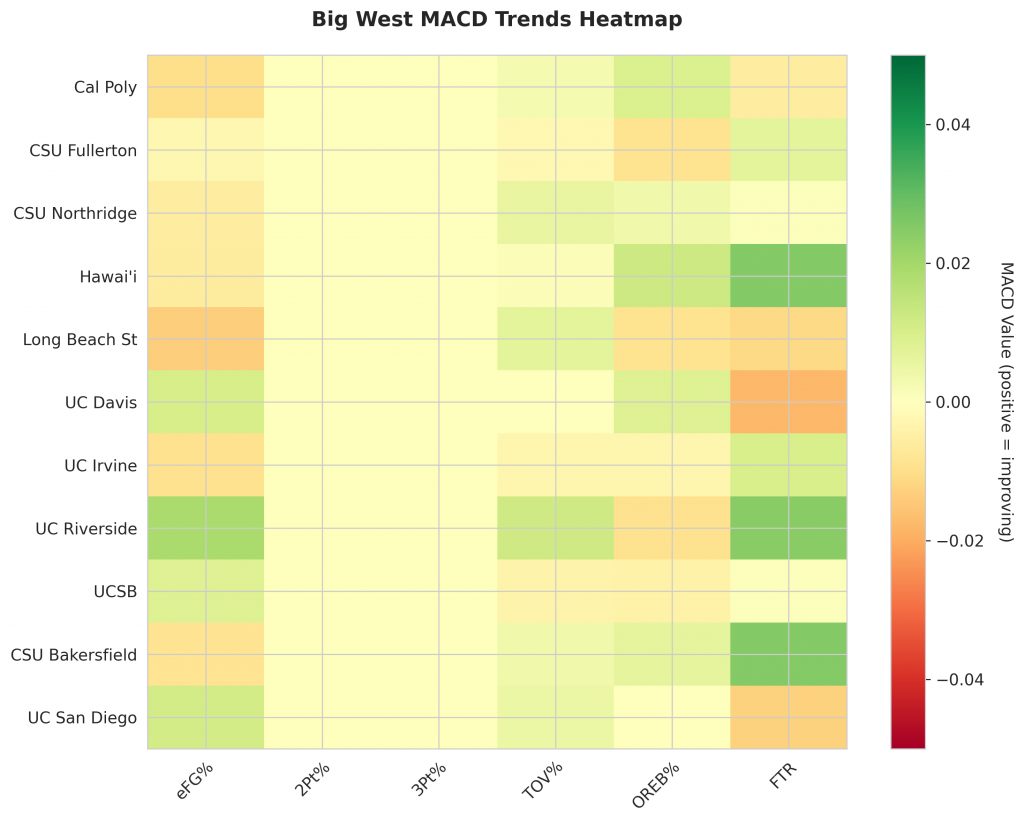 As Big West teams continue their season, the MACD trending indicators will help identify which teams are genuinely improving versus those riding unsustainable momentum. Check back next week for updated analysis.