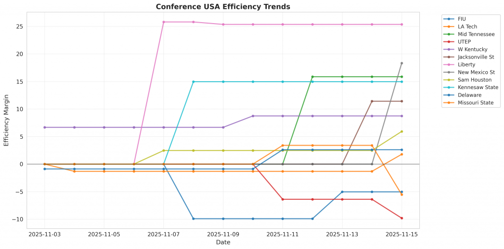 Figure 1: Efficiency margin trends for Conference USA teams throughout the season. Teams trending upward show improving performance, while downward trends indicate struggles.