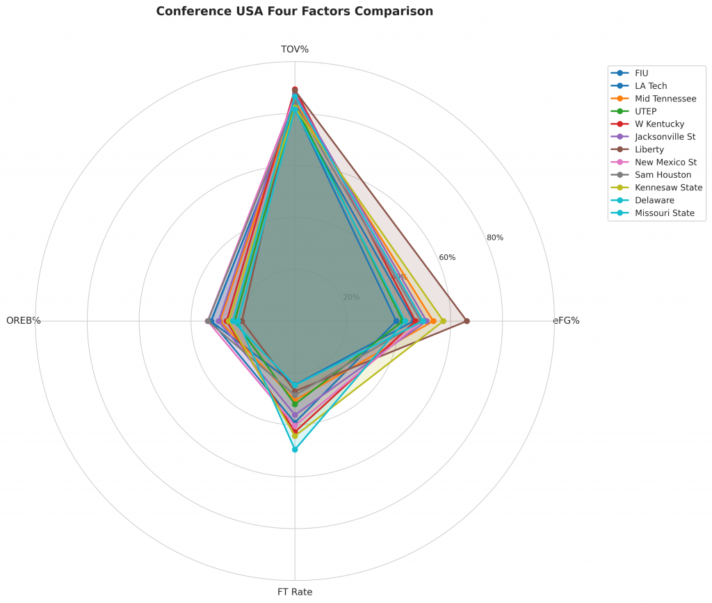Figure 2: Four Factors comparison across Conference USA teams. The radar chart shows each team’s offensive efficiency (eFG%), ball security (TOV%), rebounding (OREB%), and free throw generation (FT Rate).