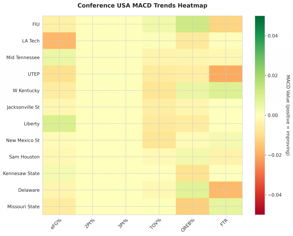As Conference USA teams continue their season, the MACD trending indicators will help identify which teams are genuinely improving versus those riding unsustainable momentum. Check back next week for updated analysis.