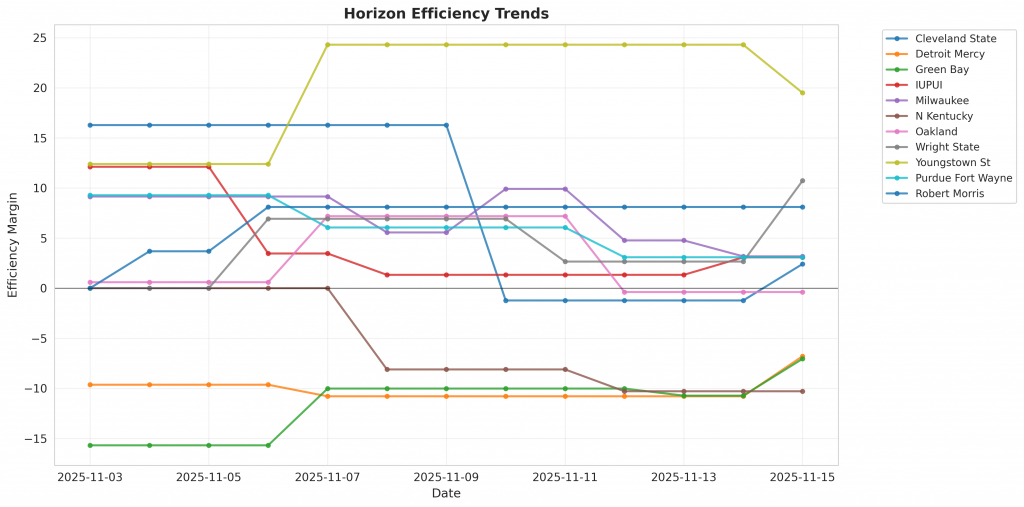 Figure 1: Efficiency margin trends for Horizon teams throughout the season. Teams trending upward show improving performance, while downward trends indicate struggles.