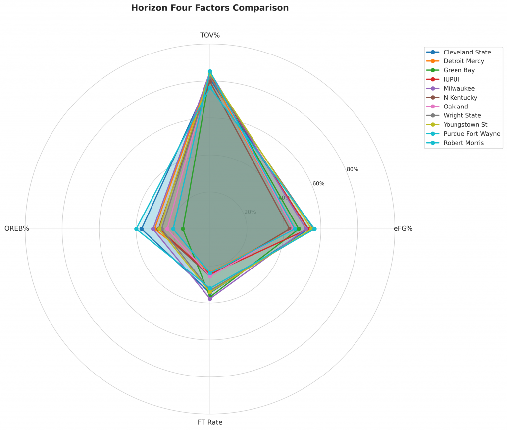 Figure 2: Four Factors comparison across Horizon teams. The radar chart shows each team’s offensive efficiency (eFG%), ball security (TOV%), rebounding (OREB%), and free throw generation (FT Rate).