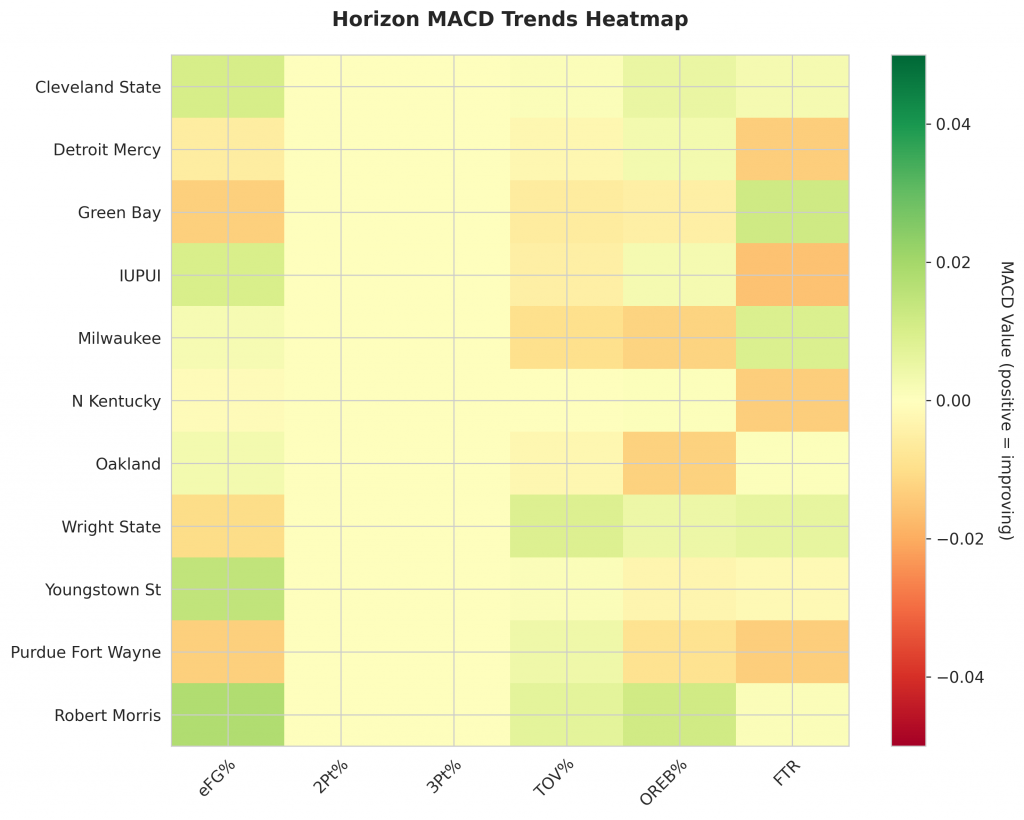 As Horizon teams continue their season, the MACD trending indicators will help identify which teams are genuinely improving versus those riding unsustainable momentum. Check back next week for updated analysis.