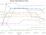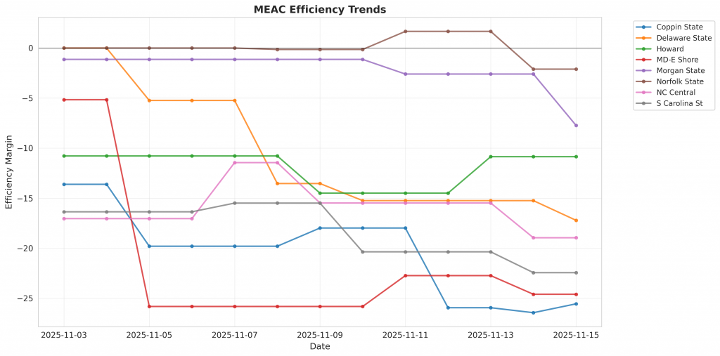 Figure 1: Efficiency margin trends for MEAC teams throughout the season. Teams trending upward show improving performance, while downward trends indicate struggles.