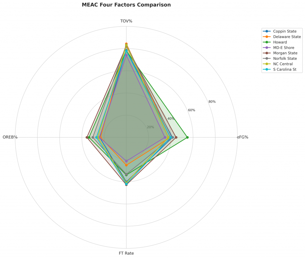 Figure 2: Four Factors comparison across MEAC teams. The radar chart shows each team’s offensive efficiency (eFG%), ball security (TOV%), rebounding (OREB%), and free throw generation (FT Rate).