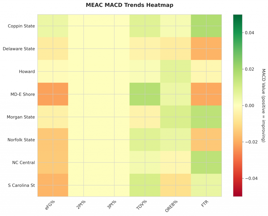 As MEAC teams continue their season, the MACD trending indicators will help identify which teams are genuinely improving versus those riding unsustainable momentum. Check back next week for updated analysis.