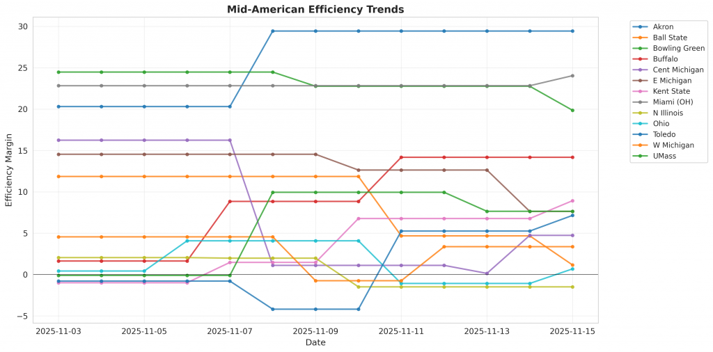 Figure 1: Efficiency margin trends for Mid-American teams throughout the season. Teams trending upward show improving performance, while downward trends indicate struggles.