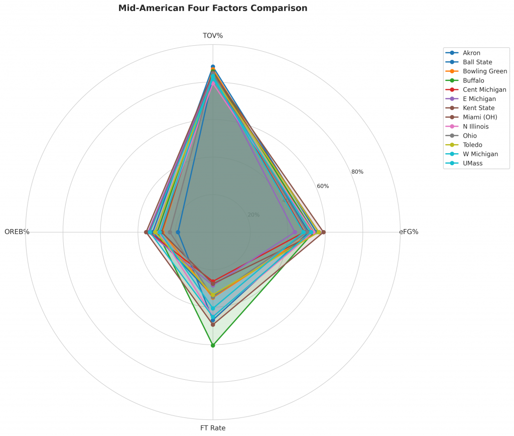 Figure 2: Four Factors comparison across Mid-American teams. The radar chart shows each team’s offensive efficiency (eFG%), ball security (TOV%), rebounding (OREB%), and free throw generation (FT Rate).