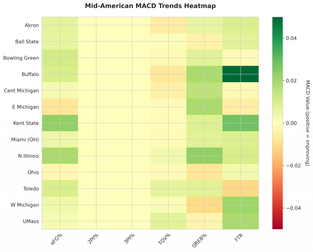 As Mid-American teams continue their season, the MACD trending indicators will help identify which teams are genuinely improving versus those riding unsustainable momentum. Check back next week for updated analysis.