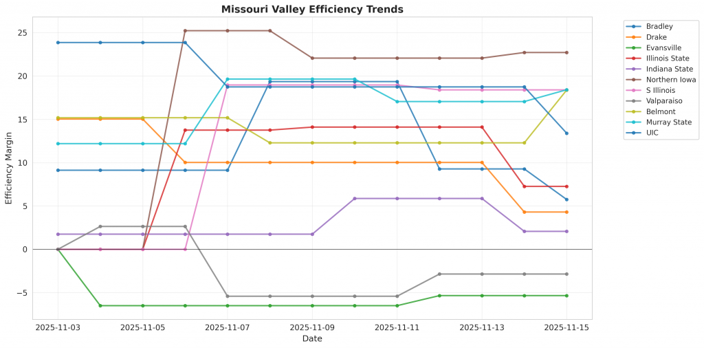 Figure 1: Efficiency margin trends for Missouri Valley teams throughout the season. Teams trending upward show improving performance, while downward trends indicate struggles.