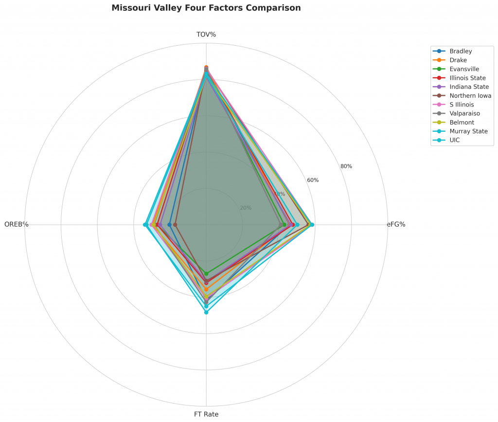 Figure 2: Four Factors comparison across Missouri Valley teams. The radar chart shows each team’s offensive efficiency (eFG%), ball security (TOV%), rebounding (OREB%), and free throw generation (FT Rate).