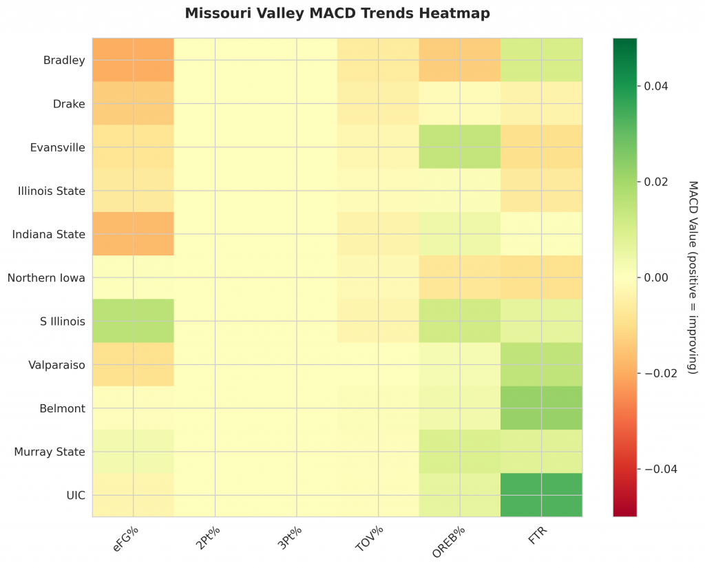 As Missouri Valley teams continue their season, the MACD trending indicators will help identify which teams are genuinely improving versus those riding unsustainable momentum. Check back next week for updated analysis.