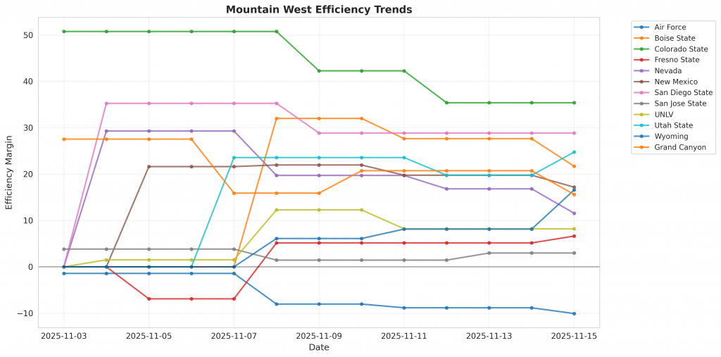 Figure 1: Efficiency margin trends for Mountain West teams throughout the season. Teams trending upward show improving performance, while downward trends indicate struggles.