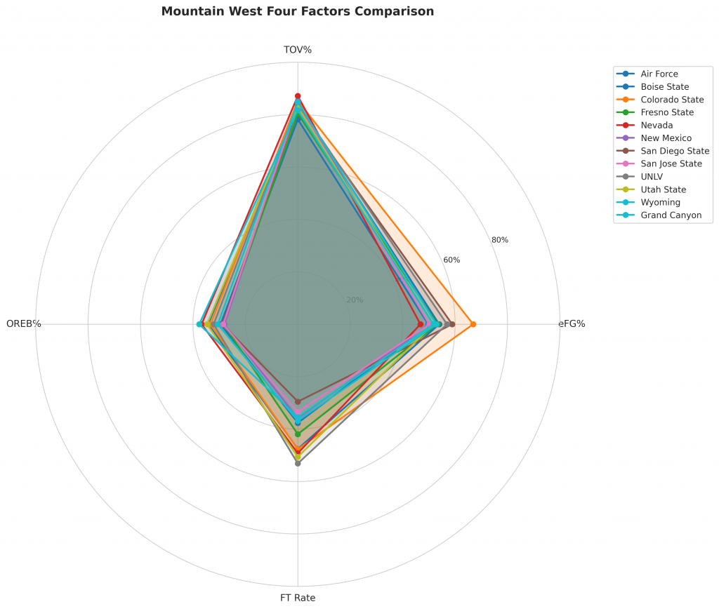 Figure 2: Four Factors comparison across Mountain West teams. The radar chart shows each team’s offensive efficiency (eFG%), ball security (TOV%), rebounding (OREB%), and free throw generation (FT Rate).