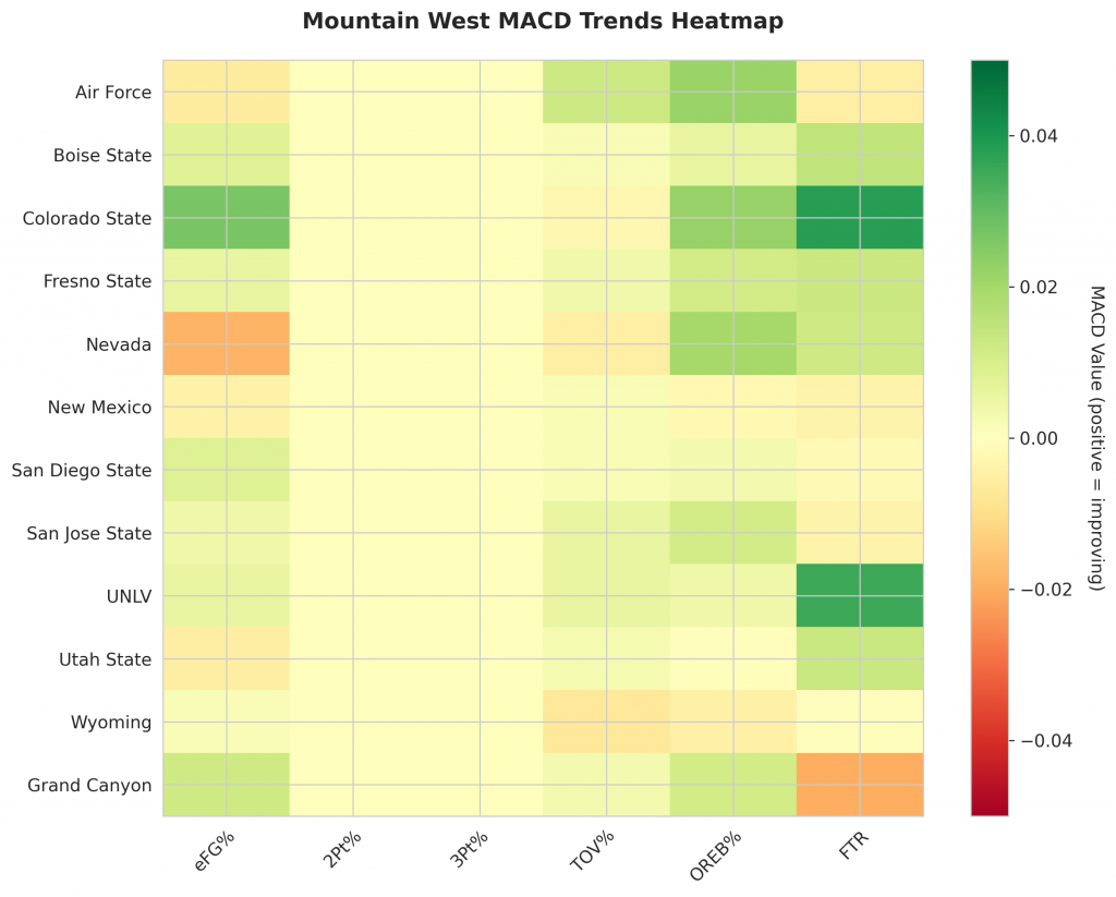 As Mountain West teams continue their season, the MACD trending indicators will help identify which teams are genuinely improving versus those riding unsustainable momentum. Check back next week for updated analysis.