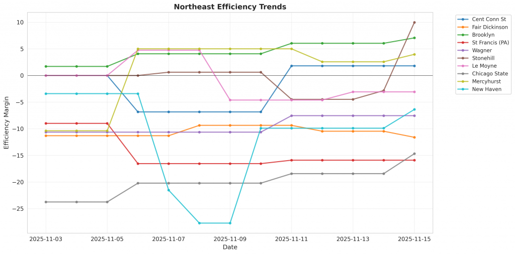 Figure 1: Efficiency margin trends for Northeast teams throughout the season. Teams trending upward show improving performance, while downward trends indicate struggles.
