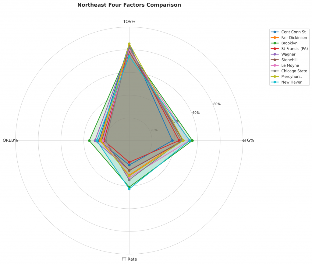 Figure 2: Four Factors comparison across Northeast teams. The radar chart shows each team’s offensive efficiency (eFG%), ball security (TOV%), rebounding (OREB%), and free throw generation (FT Rate).
