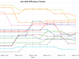 - Trending Down (Efficiency): Alabama, Arkansas, Auburn, Florida, Georgia