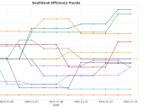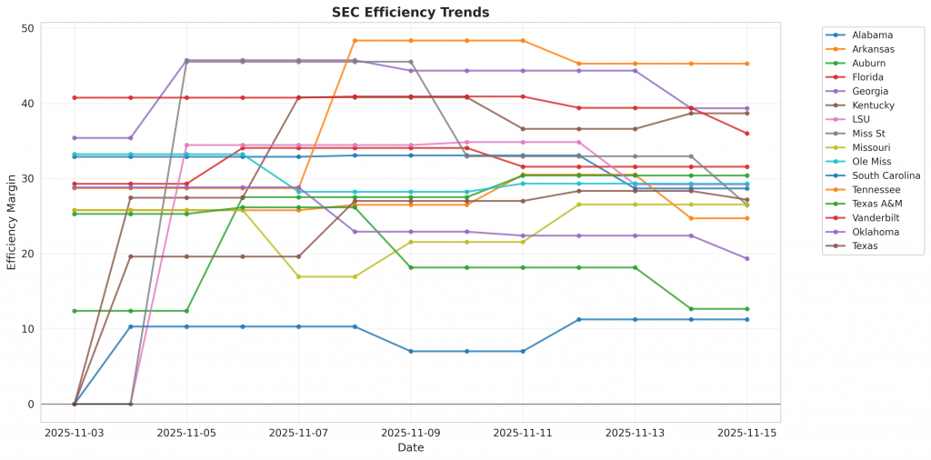 Figure 1: Efficiency margin trends for SEC teams throughout the season. Teams trending upward show improving performance, while downward trends indicate struggles.