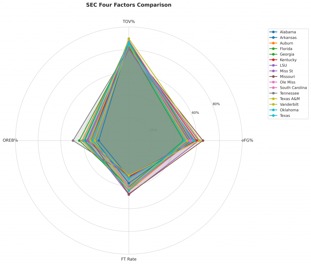 Figure 2: Four Factors comparison across SEC teams. The radar chart shows each team’s offensive efficiency (eFG%), ball security (TOV%), rebounding (OREB%), and free throw generation (FT Rate).