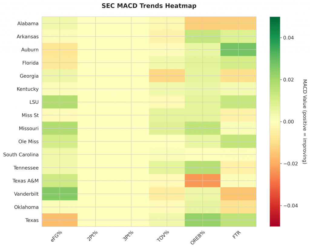 As SEC teams continue their season, the MACD trending indicators will help identify which teams are genuinely improving versus those riding unsustainable momentum. Check back next week for updated analysis.