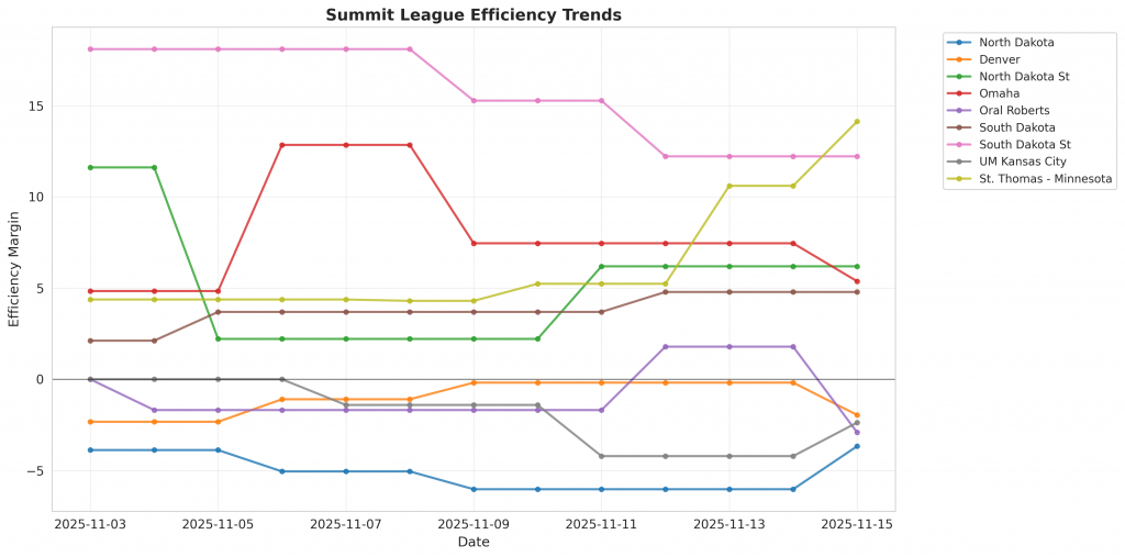 Figure 1: Efficiency margin trends for Summit League teams throughout the season. Teams trending upward show improving performance, while downward trends indicate struggles.
