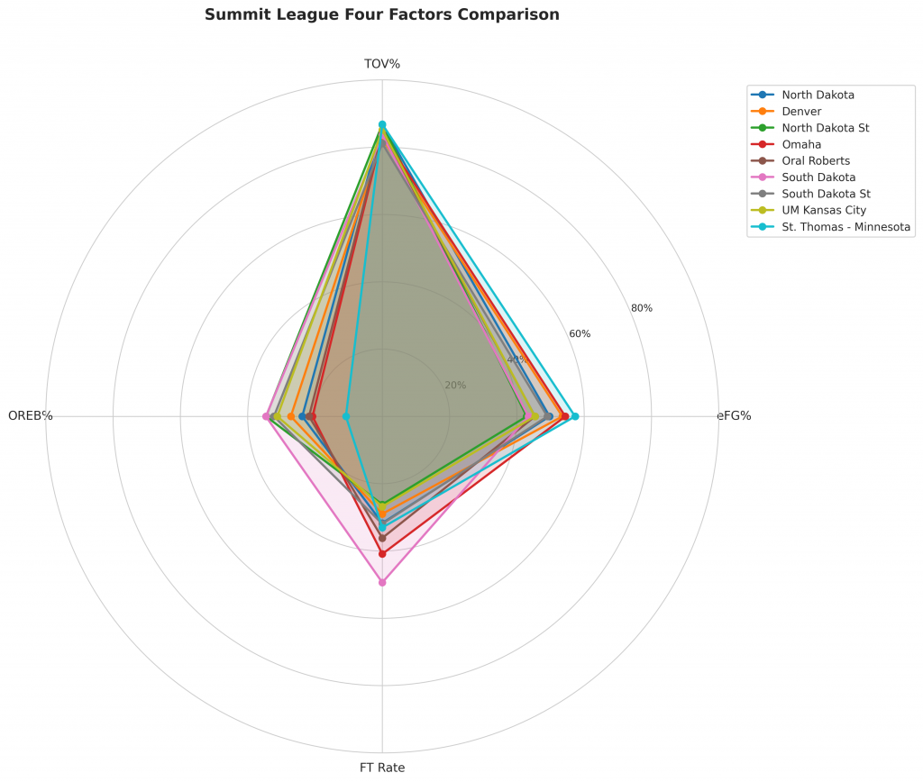 Figure 2: Four Factors comparison across Summit League teams. The radar chart shows each team’s offensive efficiency (eFG%), ball security (TOV%), rebounding (OREB%), and free throw generation (FT Rate).