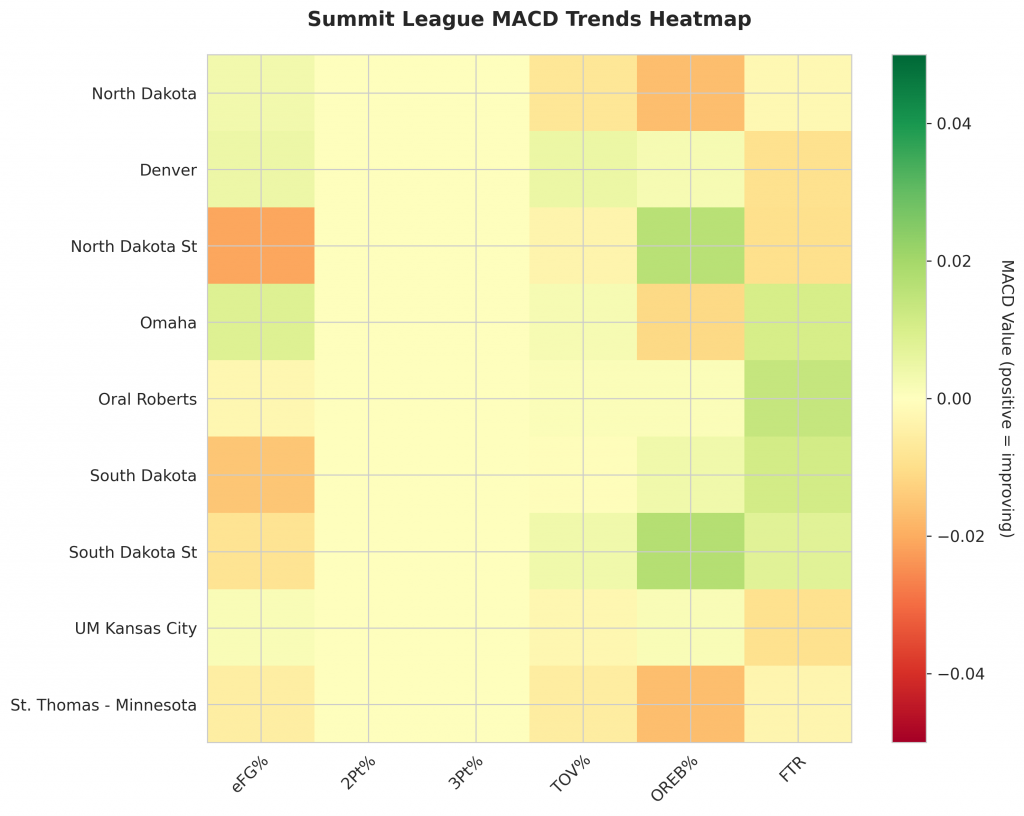 As Summit League teams continue their season, the MACD trending indicators will help identify which teams are genuinely improving versus those riding unsustainable momentum. Check back next week for updated analysis.