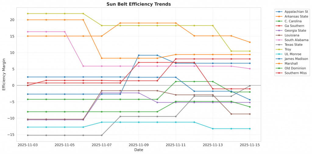 Figure 1: Efficiency margin trends for Sun Belt teams throughout the season. Teams trending upward show improving performance, while downward trends indicate struggles.