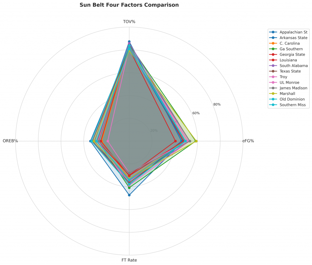 Figure 2: Four Factors comparison across Sun Belt teams. The radar chart shows each team’s offensive efficiency (eFG%), ball security (TOV%), rebounding (OREB%), and free throw generation (FT Rate).