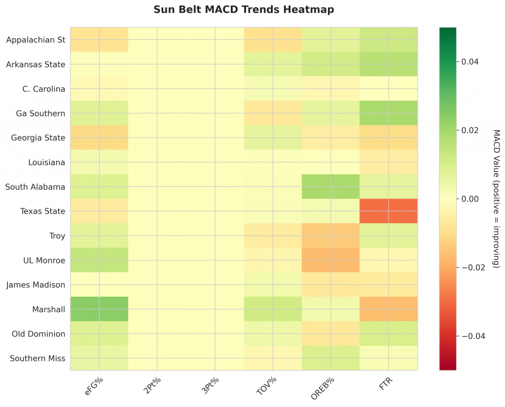 As Sun Belt teams continue their season, the MACD trending indicators will help identify which teams are genuinely improving versus those riding unsustainable momentum. Check back next week for updated analysis.