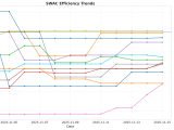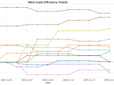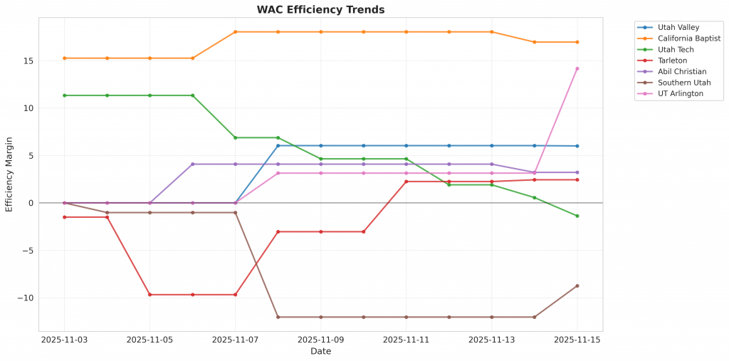 Figure 1: Efficiency margin trends for WAC teams throughout the season. Teams trending upward show improving performance, while downward trends indicate struggles.
