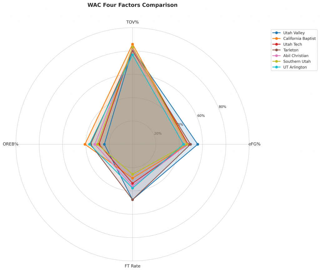 Figure 2: Four Factors comparison across WAC teams. The radar chart shows each team’s offensive efficiency (eFG%), ball security (TOV%), rebounding (OREB%), and free throw generation (FT Rate).